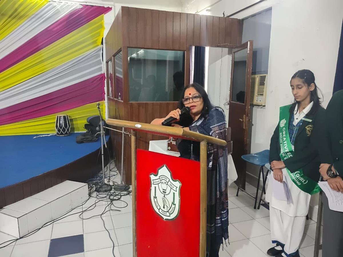Principal, Ms. Ruchi Chabra, addressed the gathering, reflecting on Guru Nanak Dev Ji's message of truth, humility, and service to humanity. She said that in a world of distractions, true strength lies in mastering oneself-remaining calm amid chaos, kind amid conflict, and focused amid temptation. Quoting "Man jeete jag jeet," she urged students to practice self- discipline and live by the values of seva (service), simran (mindfulness), and sach (truth).